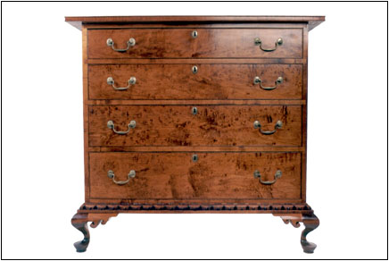 This chest features bandy legs, flowered ogee molding around the base, and cock- beaded drawers and top. The hard maple is figured and adds interest to the facade of the piece.