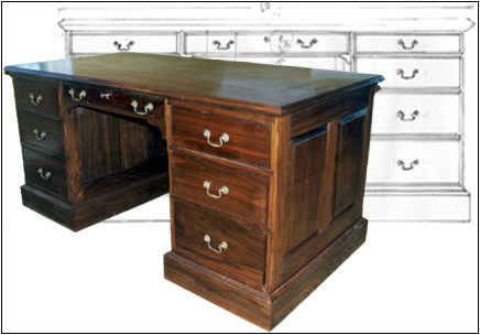 The desk contains two file drawers, two cabinets on the opposite side of the drawers, and a secret compartment for important documents. The top of this desk is is made from a single Claro walnut board.