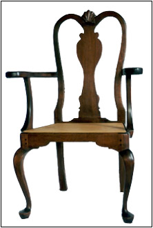 Queen Anne chairs feature curved rear stiles (leg posts) and cabriole legs in front. This model utilizes a solid splat and a hand-carved shell on the crest rail.